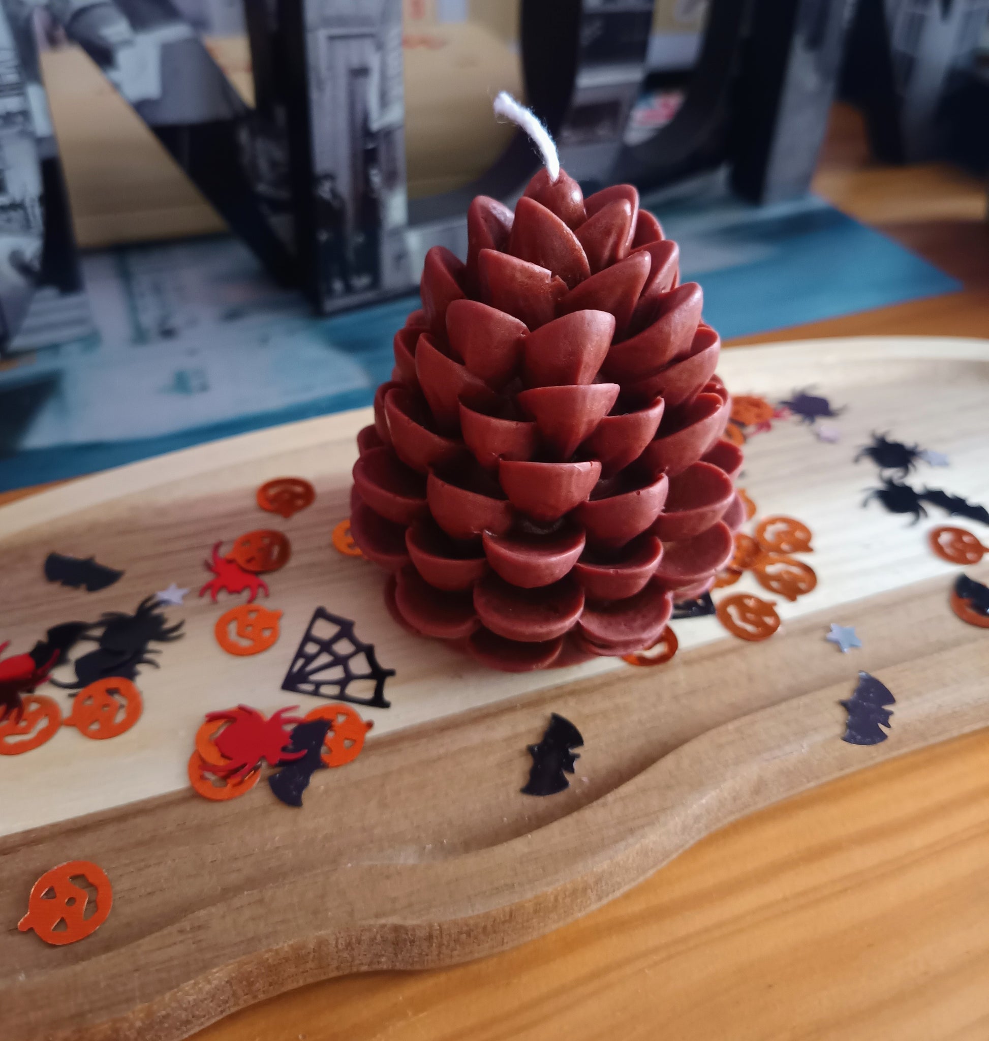 Bougie en forme de pomme de pin, faite en cire de soja, avec colorant marron, parfumée ou non (7%) avec une mèche en coton.