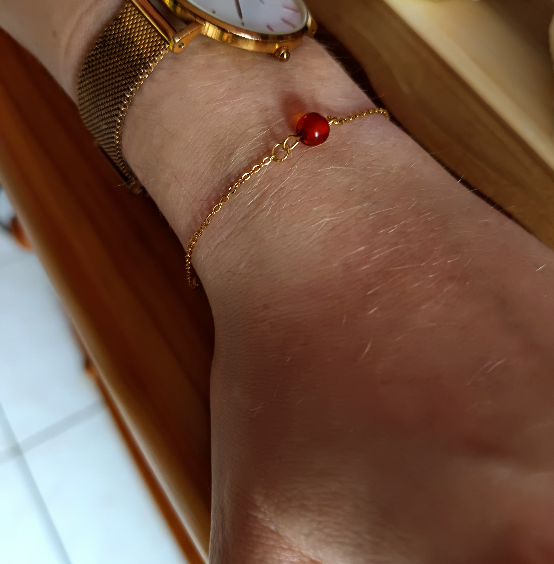Bracelet composé d'une chaine en acier inoxydable doré et d'une perle ronde transparente en résine de couleur ambre.